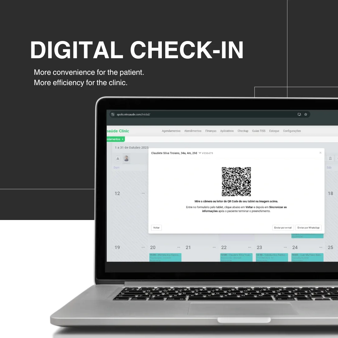 In Ninsaúde Clinic, the digital check-in feature was designed to make the experience simple and intuitive for everyone involved. There are two main ways to perform it, depending on each clinic’s workflow.