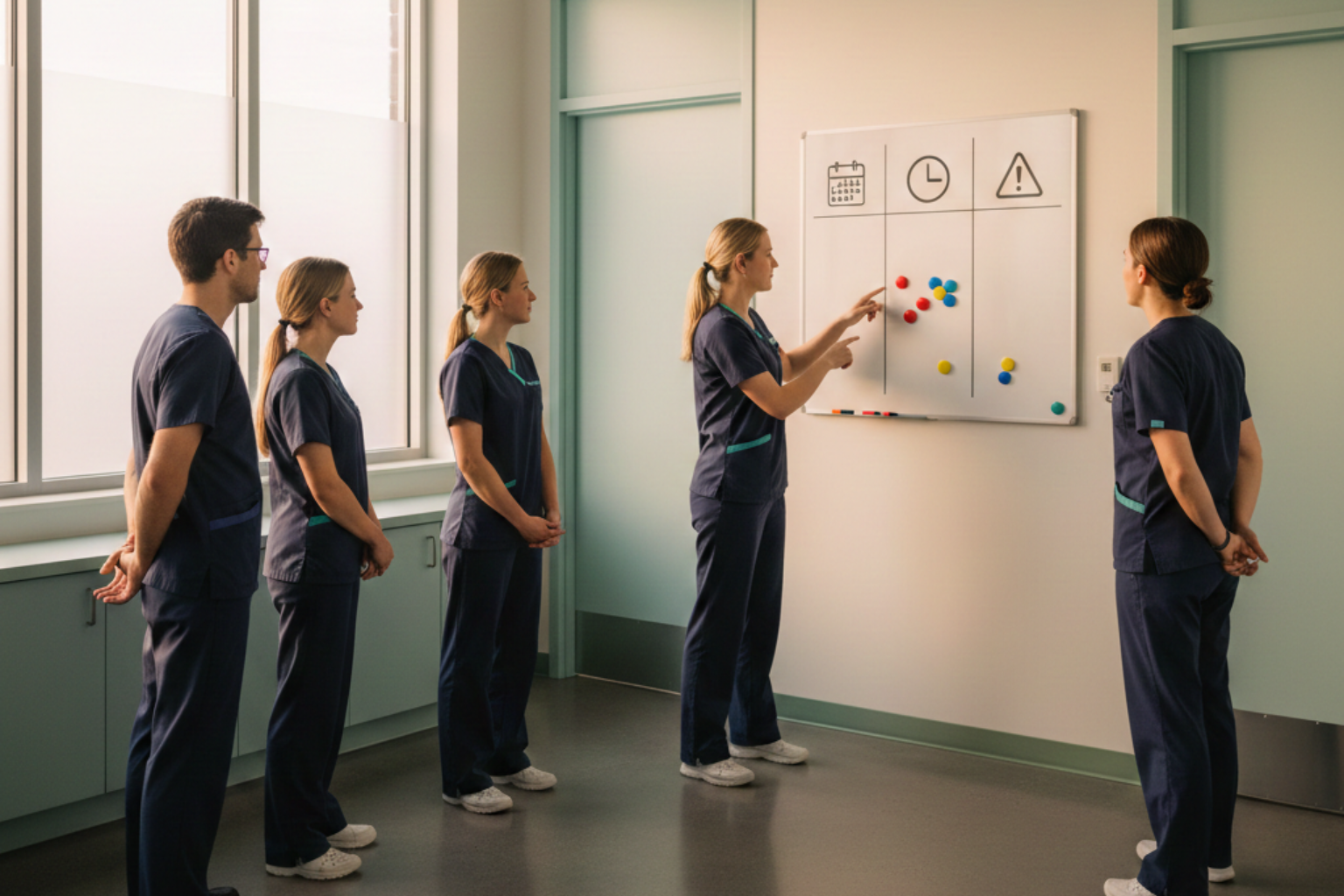 - One quality priority for the day (for example: reduce rework in registration).