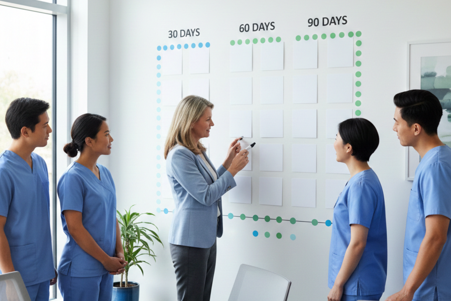 - 60 days: adjust schedule/capacity, solidify huddles and 1:1s, run micro-trainings.